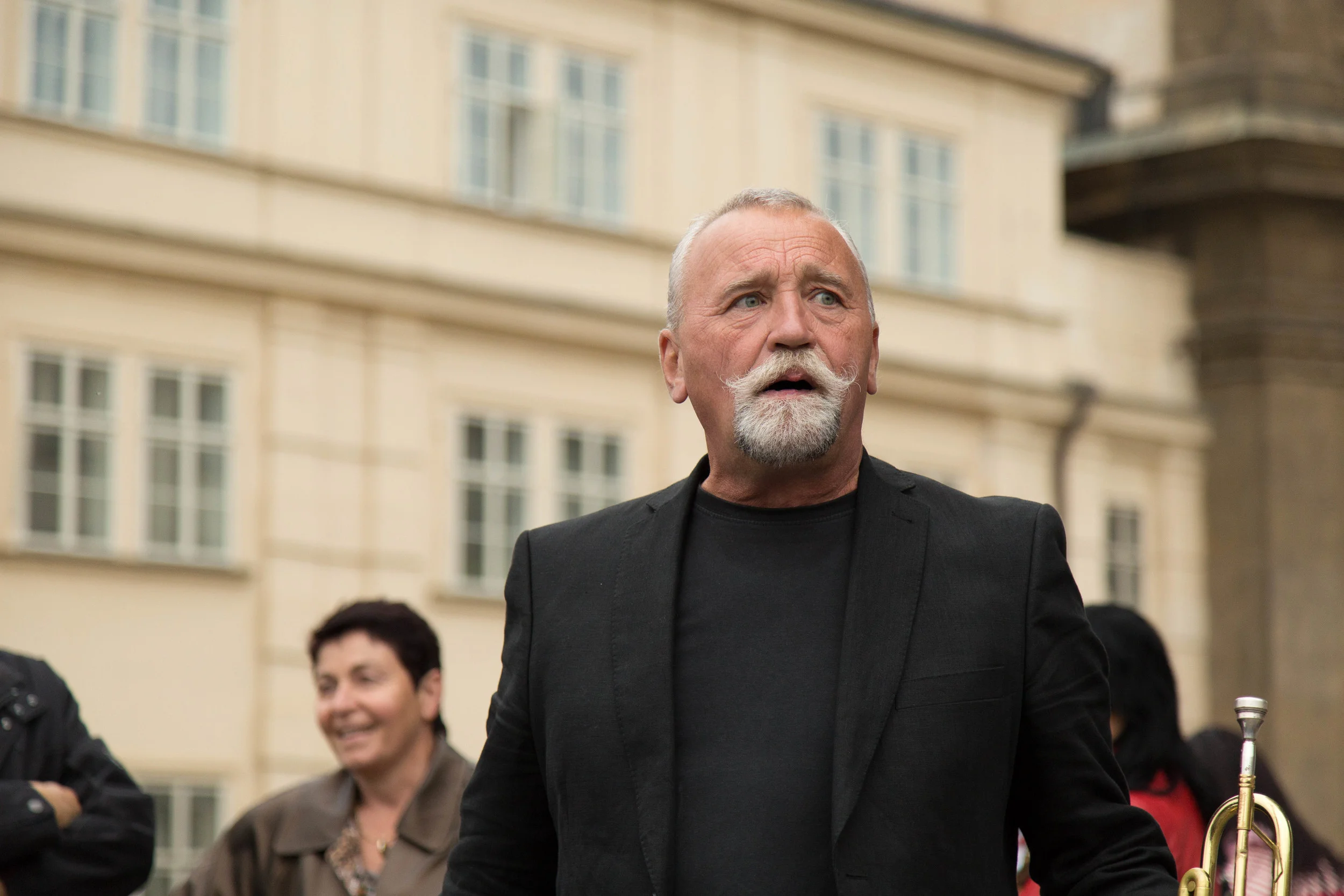 Older man with a white beard and mustache, wearing a black blazer and shirt, with an expressive surprised or concerned facial expression, standing outdoors with a beige building and several smiling people in the background.