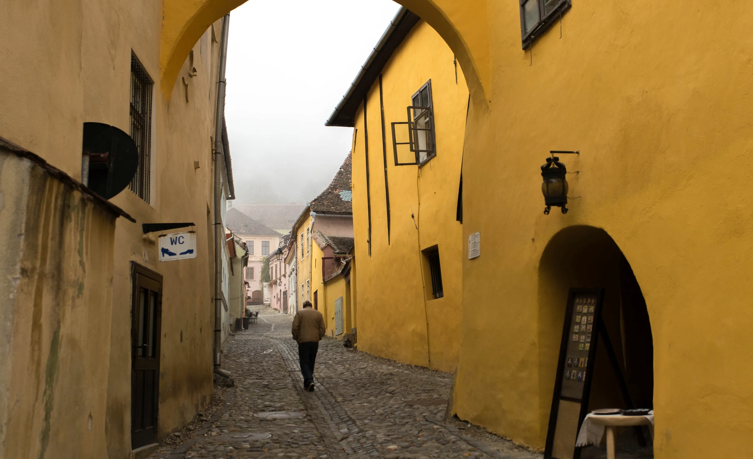 A narrow cobblestone street in a European town with colorful buildings, a person walking away, and an archway overhead on a foggy day.