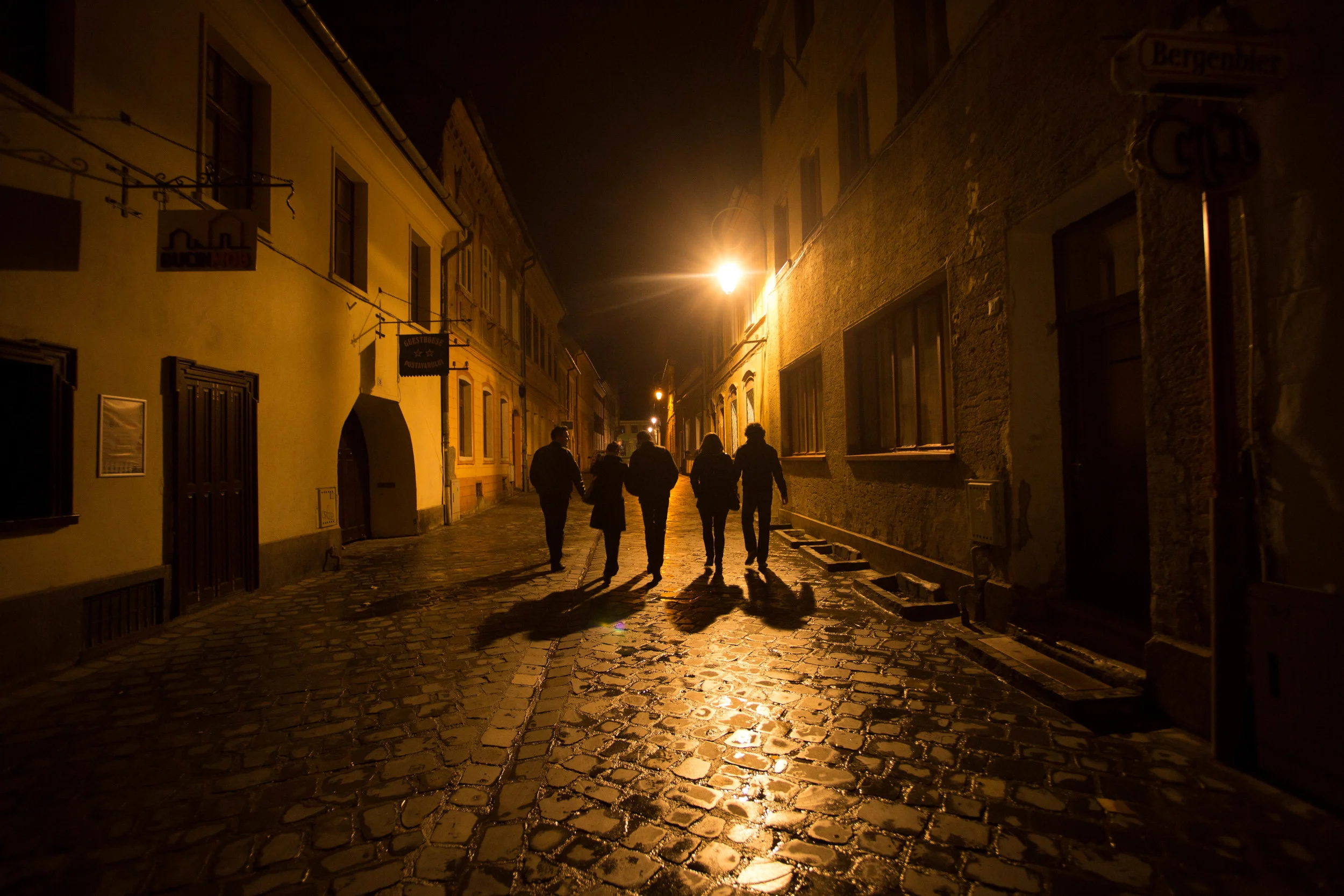 A group of five people walking down a cobblestone street at night with street lamps casting warm light, creating shadows on the wet ground, surrounded by old buildings with lit windows. View fullsize