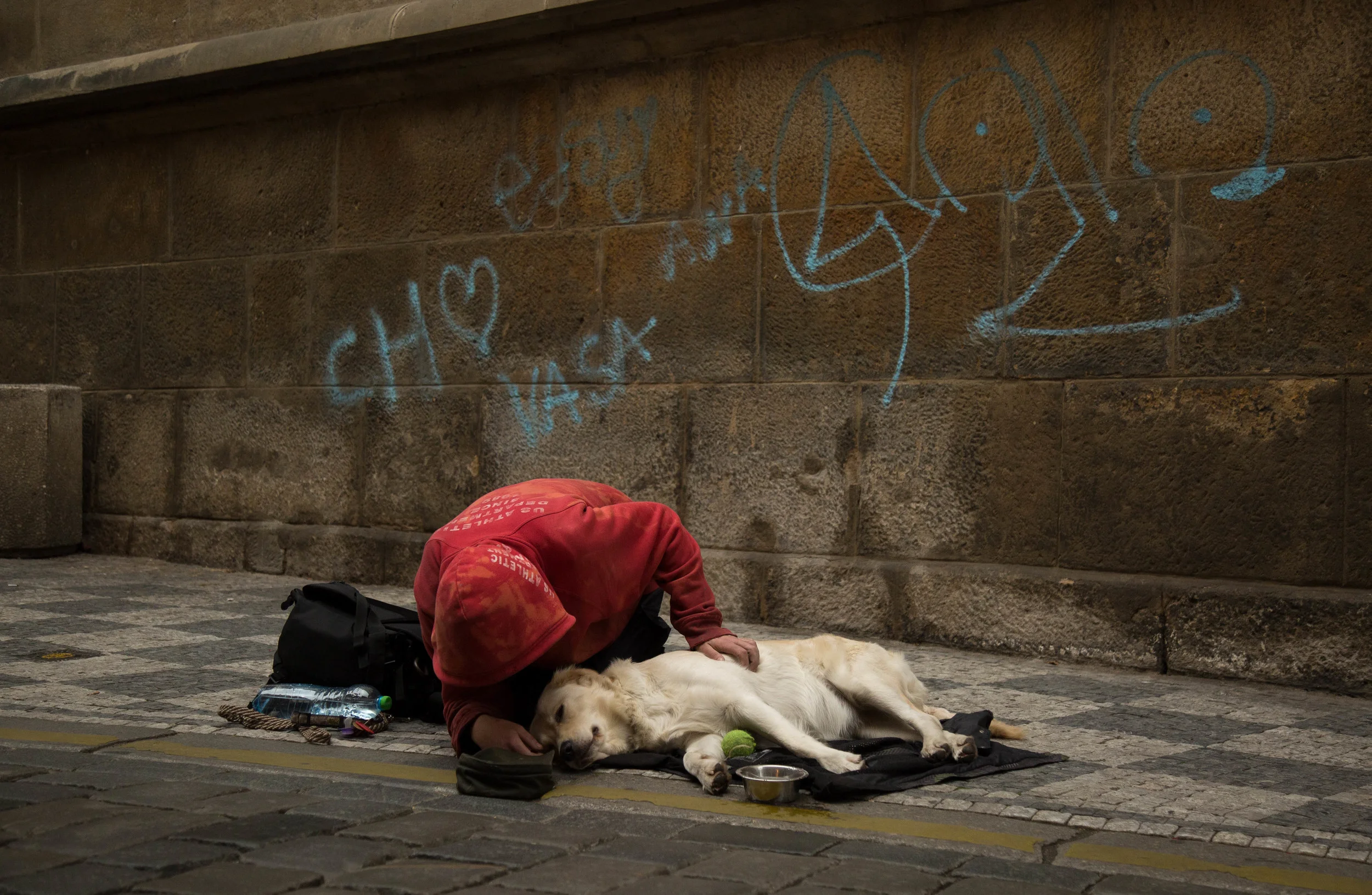 A person in a red hoodie kneels on the pavement next to a golden retriever lying on its side, seemingly sleeping, in an urban setting. There is a black bag, a water bottle, a tennis ball, and a metal bowl nearby. The wall behind has graffiti written