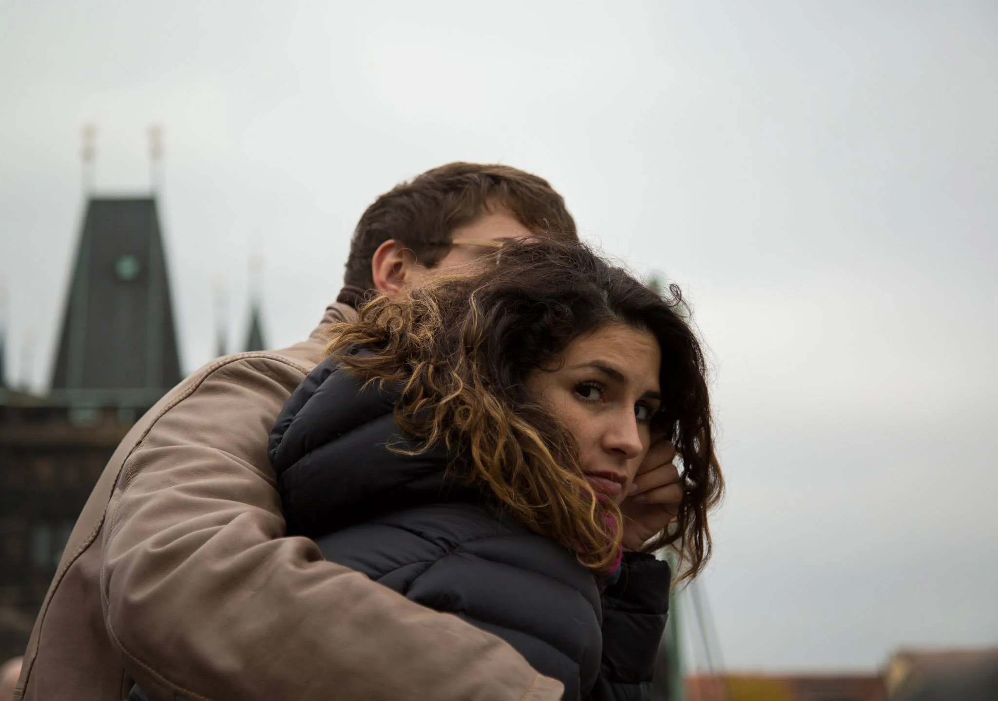 A woman resting on a man's shoulder outdoors on a cloudy day, with a city skyline in the background.