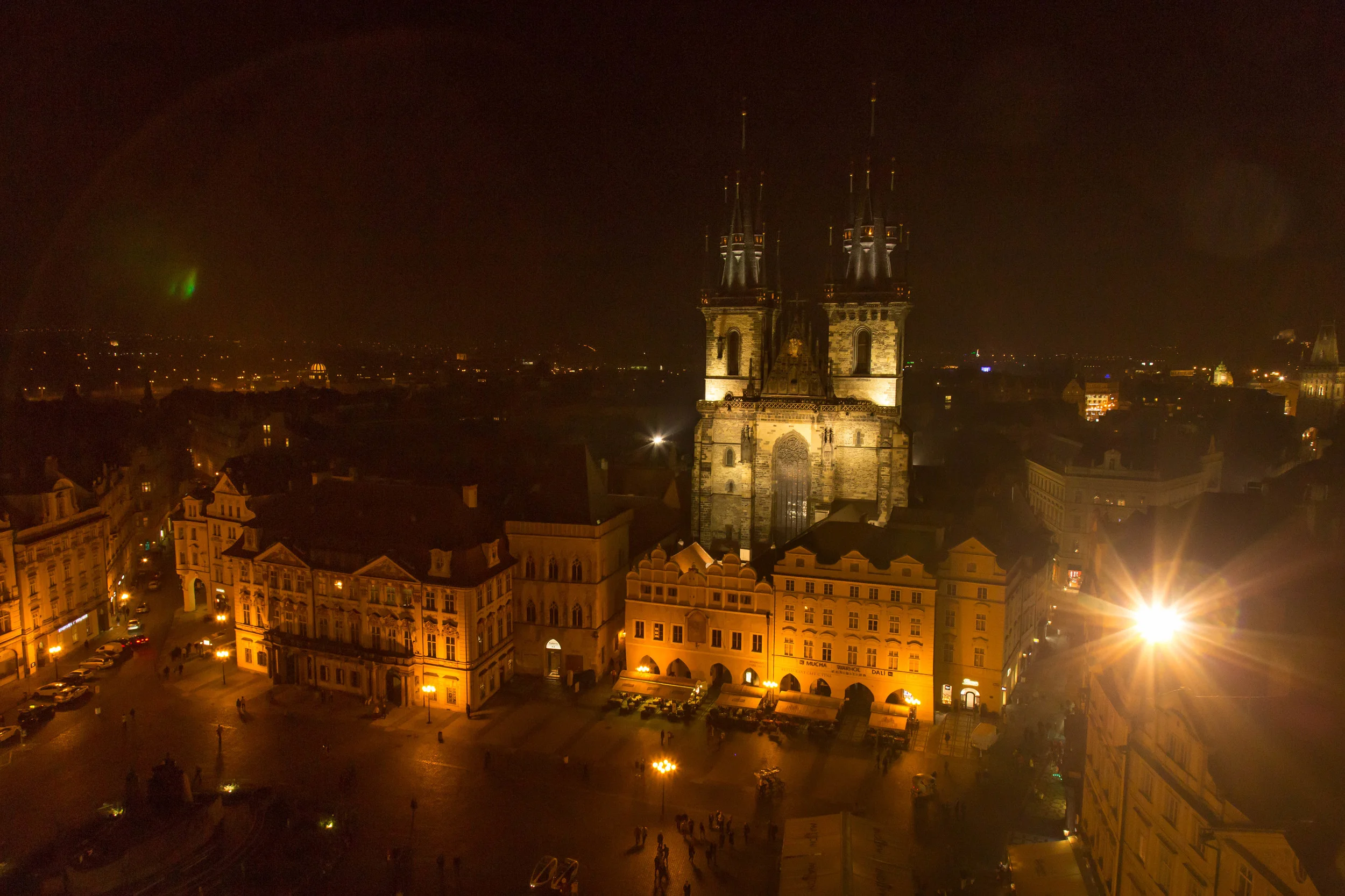 Night view of a historic city square with illuminated buildings and a large Gothic church with twin towers in the background. View fullsize