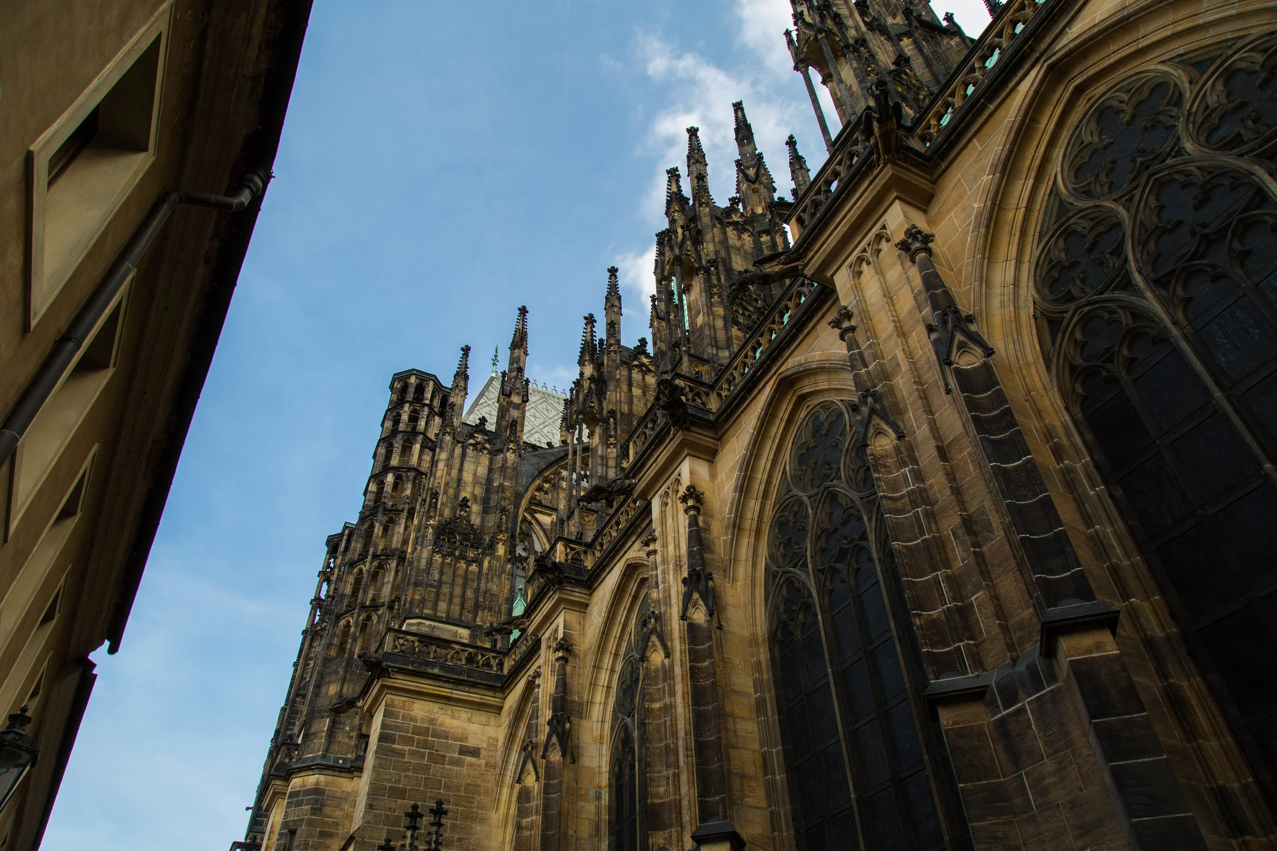 Low-angle view of a Gothic cathedral with intricate stone carvings and pointed spires against a blue sky.