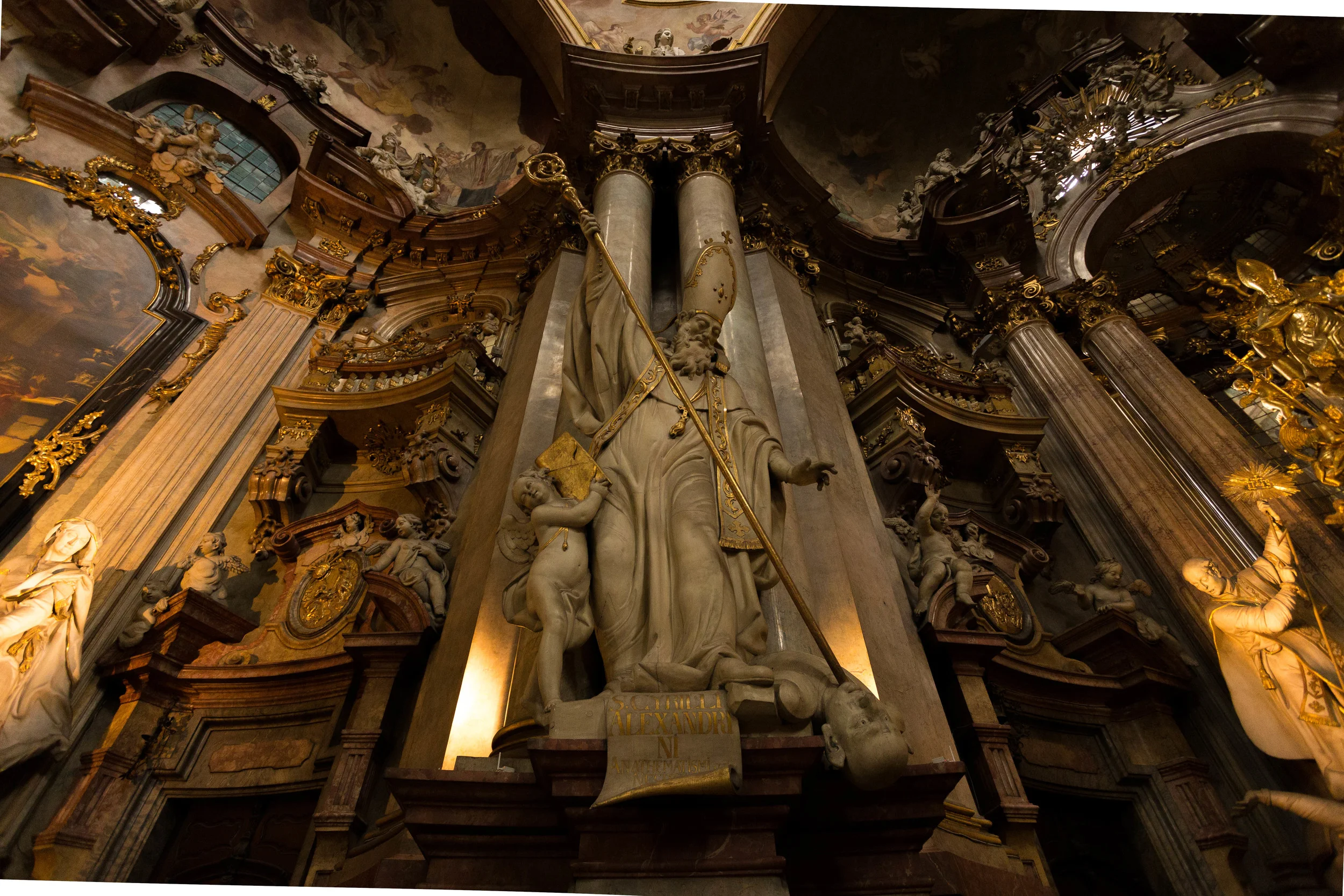 Baroque church interior with grand statues, gold accents, ornate columns, and painted ceiling, centering on a statue of a saint holding a staff and a fallen figure, with intricate woodwork and gilded decorations.