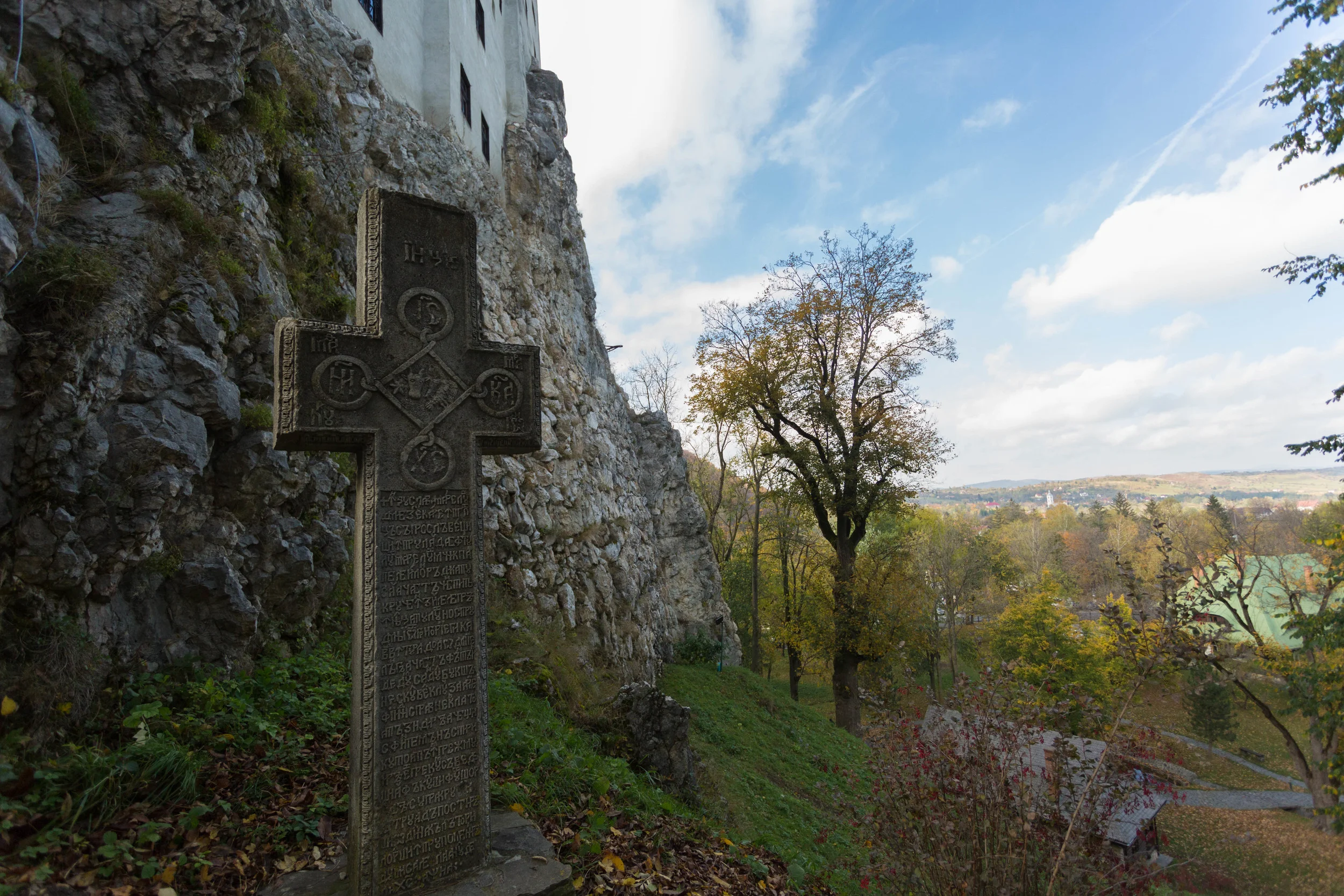 A stone cross with inscriptions beside a rocky hillside, overlooking a landscape with trees and distant buildings, under a partly cloudy sky.