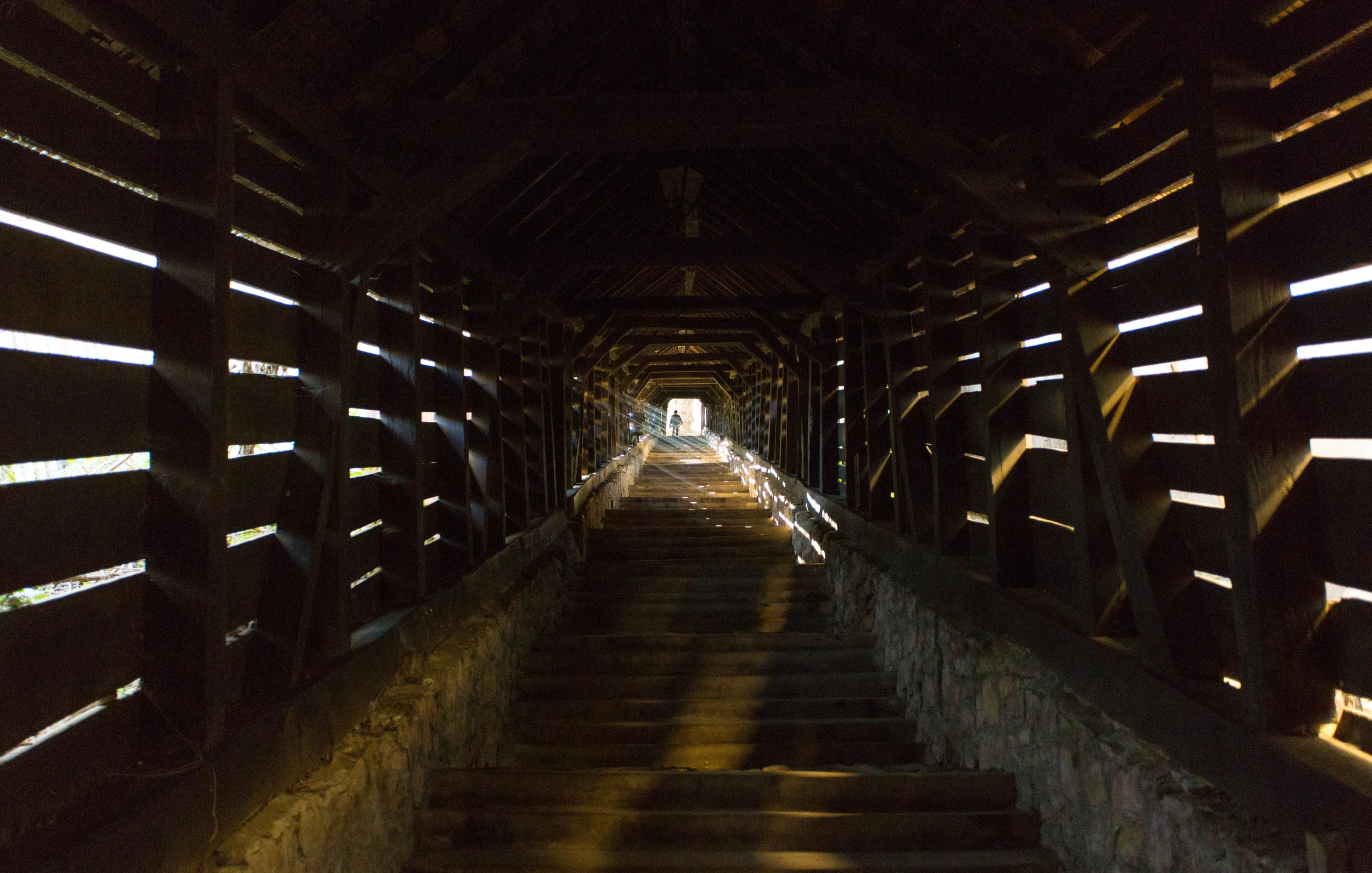 View inside a dark, wooden tunnel with sunlight coming through the gaps, leading to a person at the distant opening. View fullsize
