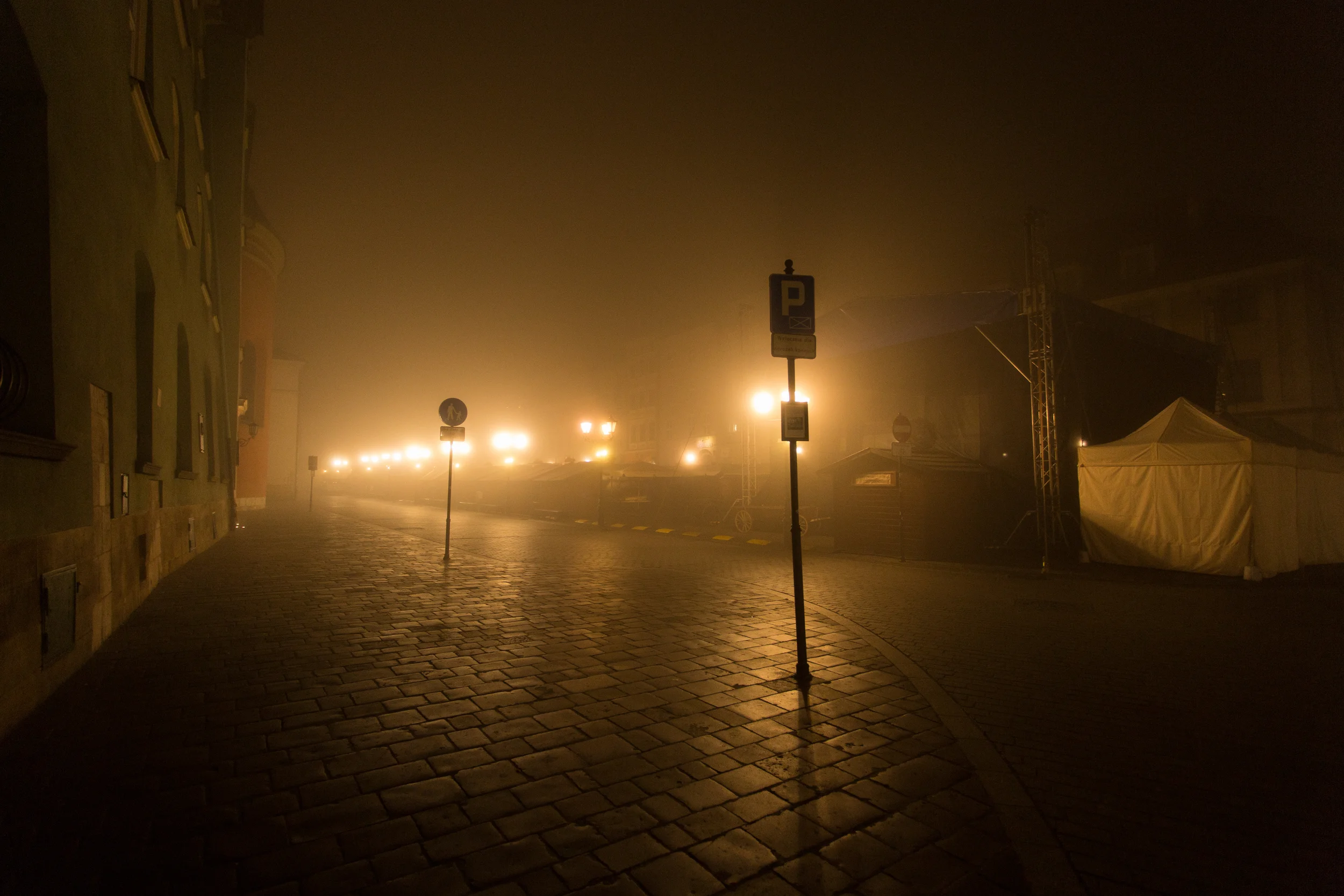 Empty cobblestone street at night with fog, dim streetlights, and a few signs, including a parking sign and a pedestrian sign, with tents or structures in the background.