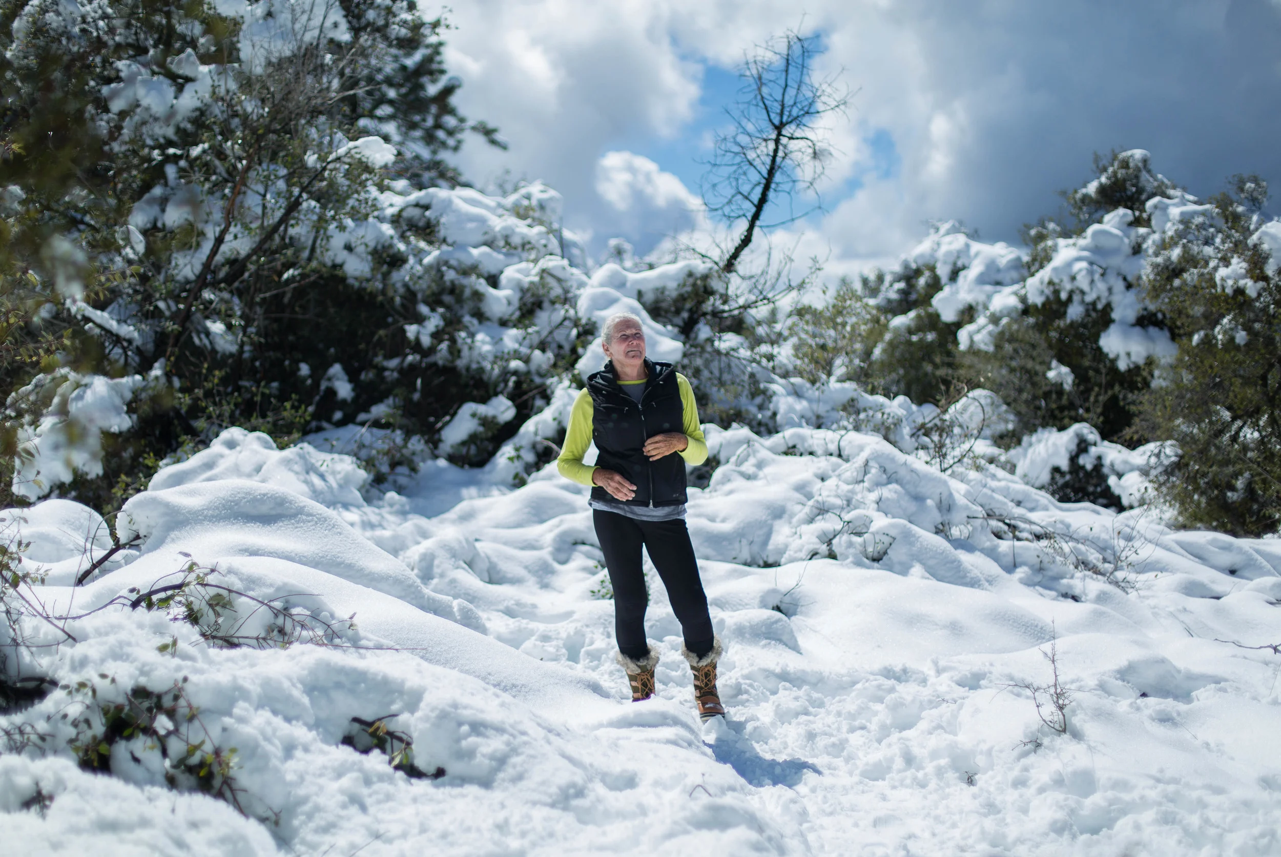 An elderly woman jogging through a snow-covered forest with snow-laden trees and a cloudy sky in the background.